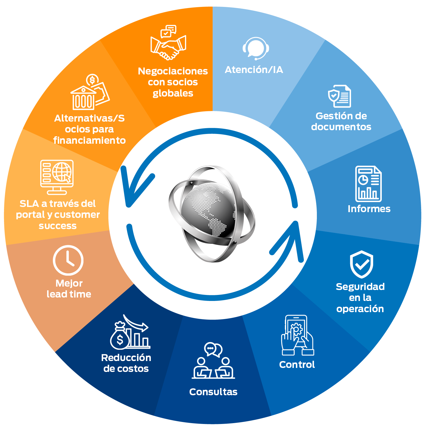 Con un enfoque integral, gestionamos toda su operación internacional, desde la planificación estratégica hasta la ejecución, garantizando la eficiencia, el cumplimiento y el rendimiento.